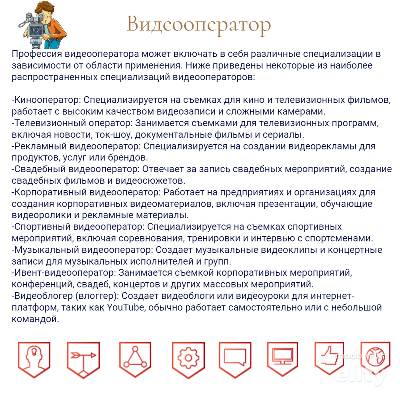 это профессионал, специализирующийся на создании и записи видеоматериалов с использованием видеотехники. Он отвечает за визуальное оформление видеоматериалов, работает с камерами, освещением и другими техническими средствами для создания качественных видеоизображений. Видеооператоры могут работать в различных областях, включая киноиндустрию, телевидение, рекламу, медиа, видеосъемку мероприятий и многое другое. Их задача — зафиксировать и передать заданный визуальный контент согласно требованиям проекта.
