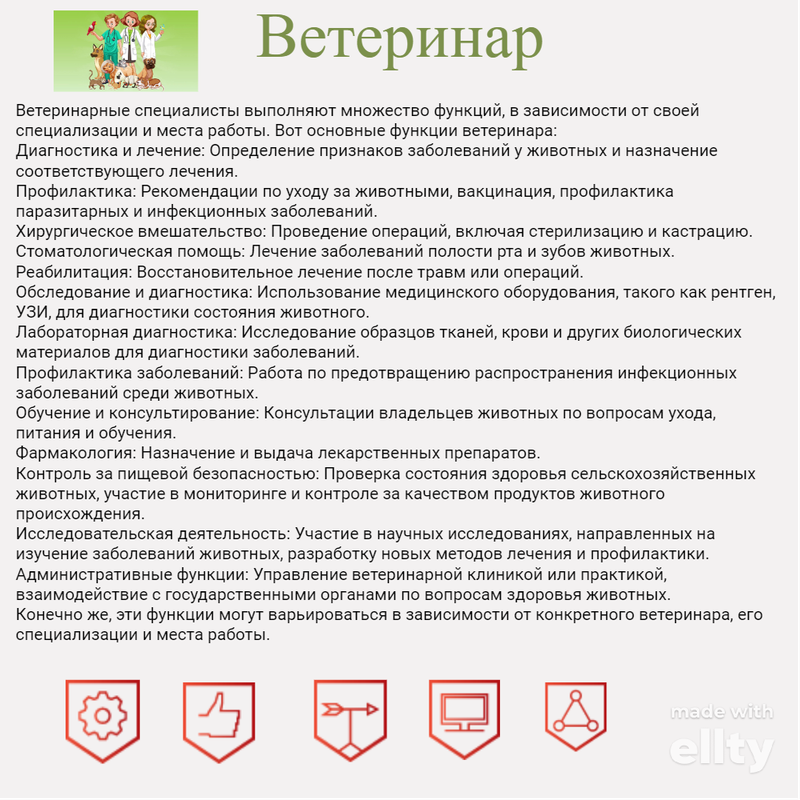 это специалист, занимающийся диагностикой и лечением заболеваний животных, а также их профилактикой и восстановлением здоровья. В зависимости от специализации ветеринар может работать как с домашними питомцами, так и с сельскохозяйственными животными, экзотическими и дикими животными. Кроме того, ветеринары играют ключевую роль в обеспечении безопасности пищевых продуктов животного происхождения, контроле за передачей заболеваний от животных к человеку и в исследовательской деятельности по изучению новых методов лечения и профилактики заболеваний у животных.